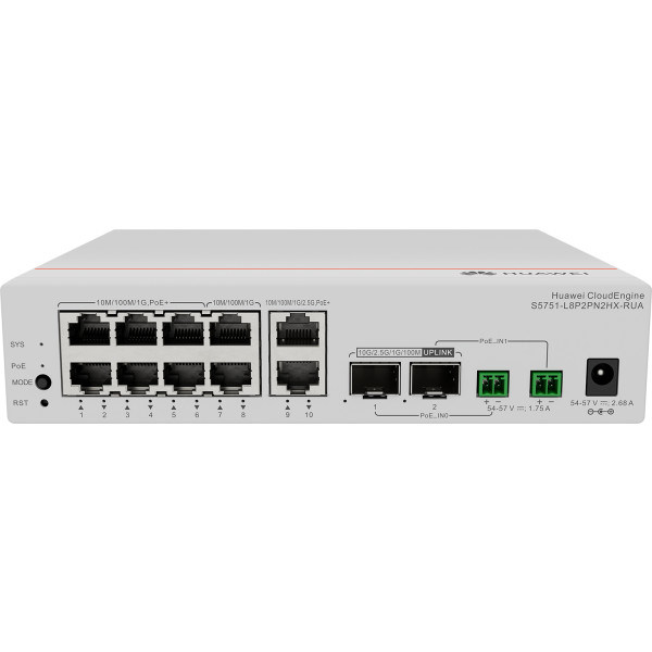 The Huawei S5751-L8P2PN2HX-RUA is a high-performance enterprise-grade switch designed for business networks, smart campuses, and small-to-medium data centers. Combining Power over Ethernet++ (PoE++), 10G uplinks, and cloud management capabilities, it delivers reliable connectivity, simplified deployments, and future-ready scalability.