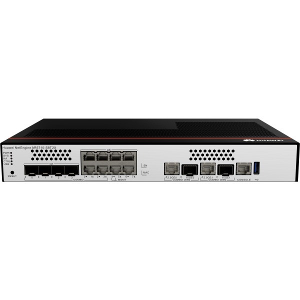 The Huawei AR5710-S8T2X is a next-generation enterprise router designed for high-speed connectivity, secure networking, and seamless cloud integration. Combining multi-core CPU performance with hardware acceleration, it delivers Gbps-level throughput, making it ideal for bandwidth-intensive applications. With built-in SD-WAN, Wi-Fi 6 support, and 5G/LTE backup, it ensures reliable connectivity for distributed enterprises, retail chains, and smart campuses.